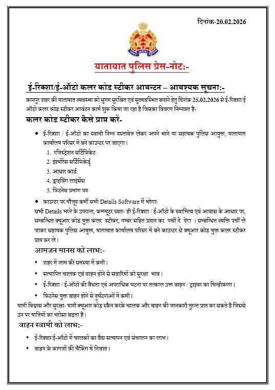 ई-रिक्शा/ई-ऑटो कलर कोड स्टीकर आवन्टन – आवश्यक सूचना:- कानपुर शहर की यातायात व्यवस्था को सुगम सुरक्षित एवं सुव्यवस्थित बनाने हेतु दिनांक 25.02.2026 से ई-रिक्शा/ई ऑटो कलर कोड स्टीकर आवंटन कार्य…