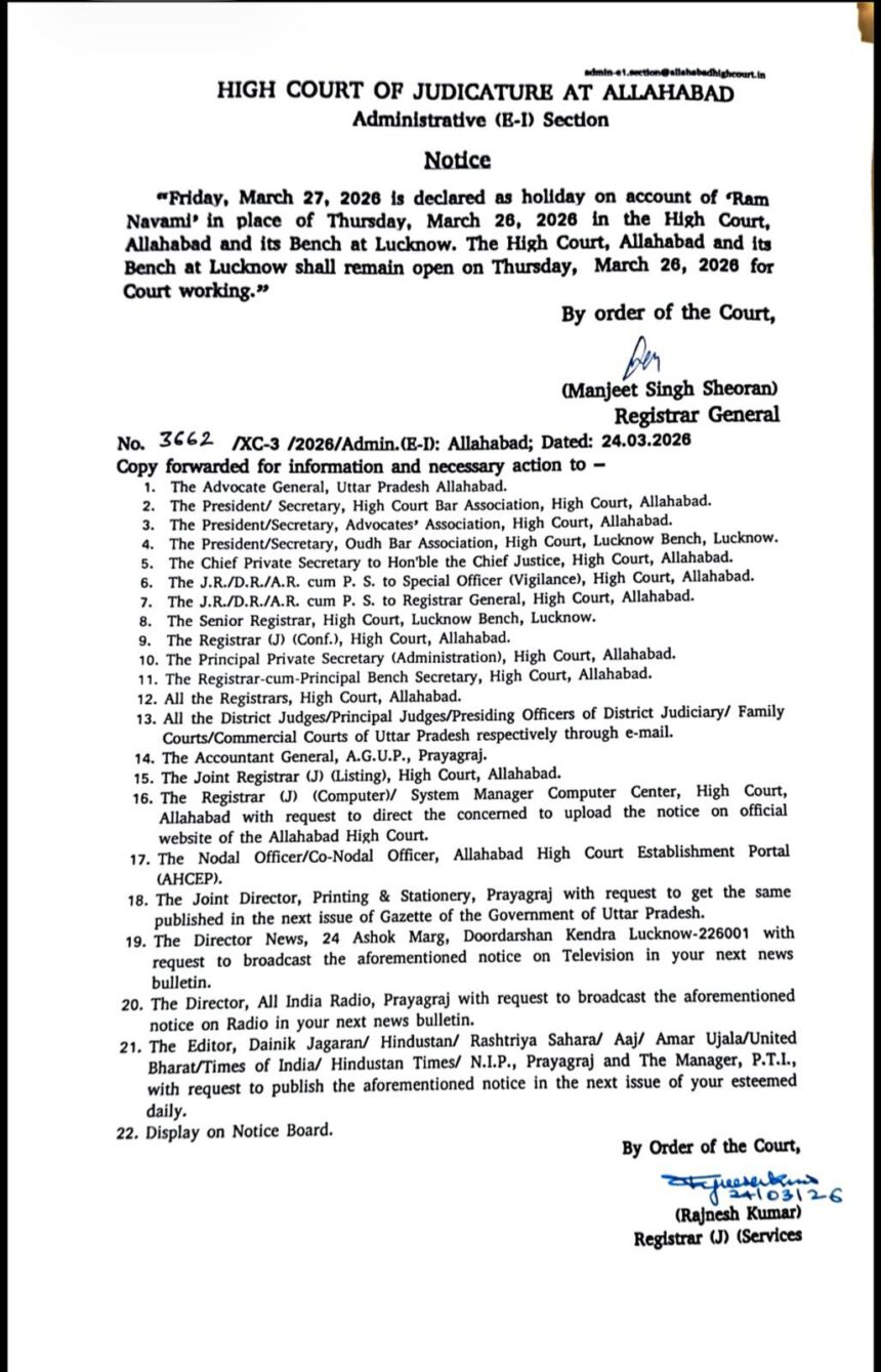 माननीय हाईकोर्ट ने रामनवमी की छुट्टी 27 मार्च घोषित की ,जबकि उत्तर प्रदेश शासन में रामनवमी का अवकाश 26 मार्च निर्धारित है, डिस्ट्रिक हेड राहुल द्विवेदी