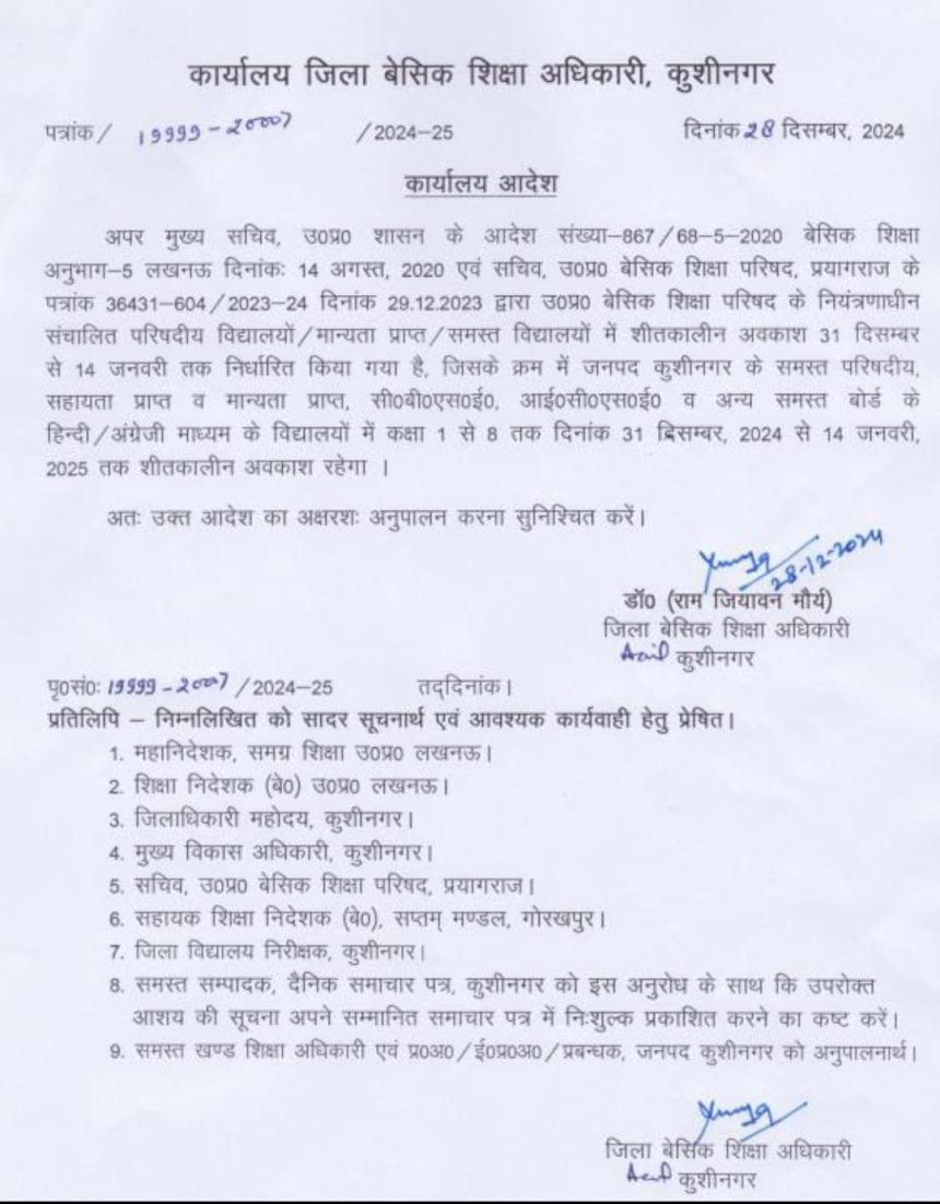 *कुशीनगर 31 दिसंबर से 14 जनवरी तक कक्षा 1 से 5 वीं कक्षा तक स्कूल में शीतकालीन अवकाश का आदेश हुआ जारी।