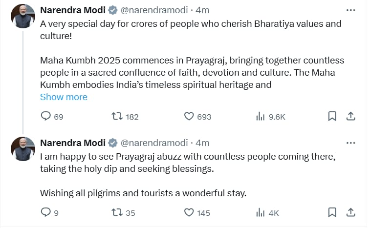 प्रधानमंत्री नरेंद्र मोदी ने ट्वीट किया, “भारतीय मूल्यों और संस्कृति को संजोने वाले करोड़ों लोगों के लिए यह एक बहुत ही खास दिन है! महाकुंभ 2025 प्रयागराज में शुरू हो रहा है, जो आस्था, भक्ति और संस्कृति के पवित्र संगम में अनगिनत लोगों को एक साथ लाएगा। महाकुंभ भारत की कालातीत आध्यात्मिक विरासत का प्रतीक है और आस्था और सद्भाव का उत्सव मनाता है…”