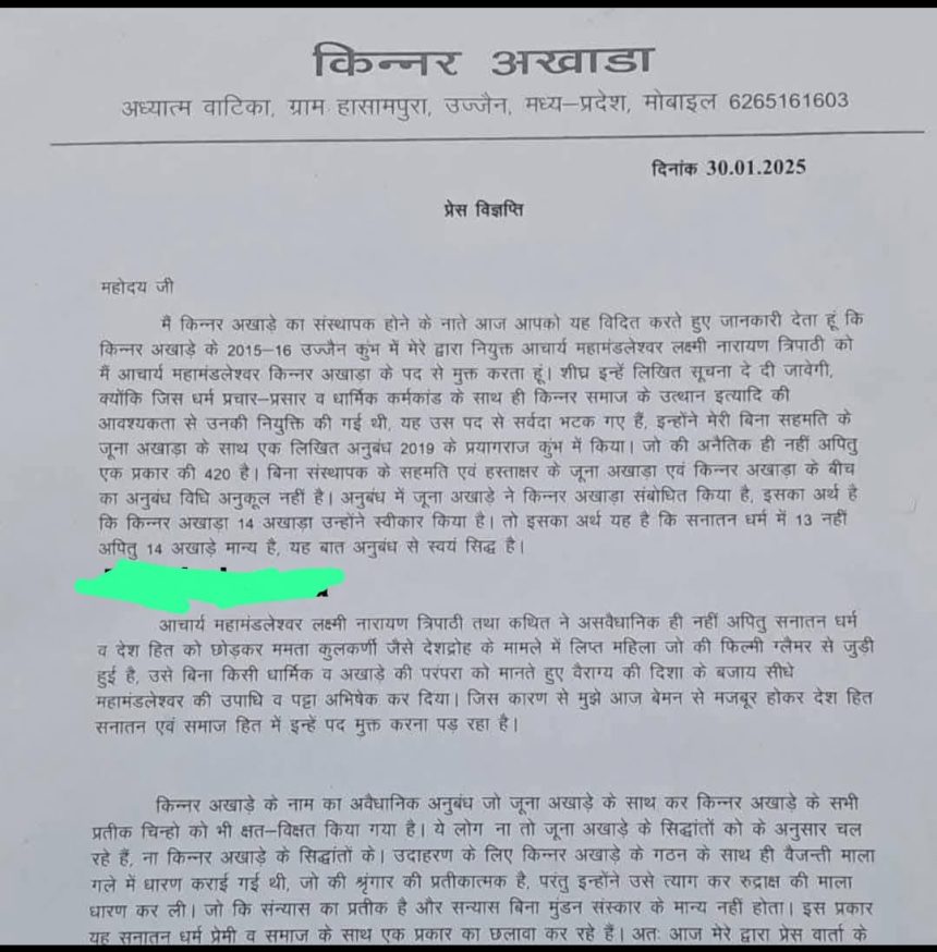 *लक्ष्मी नारायण त्रिपाठी को भी आचार्य महामंडलेश्वर पद से हटाया गया है। लक्ष्मी ने ही ममता कुलकर्णी को महामंडलेश्वर बनाया था। किन्नर अखाड़े के संस्थापक अजय दास का फैसला।*