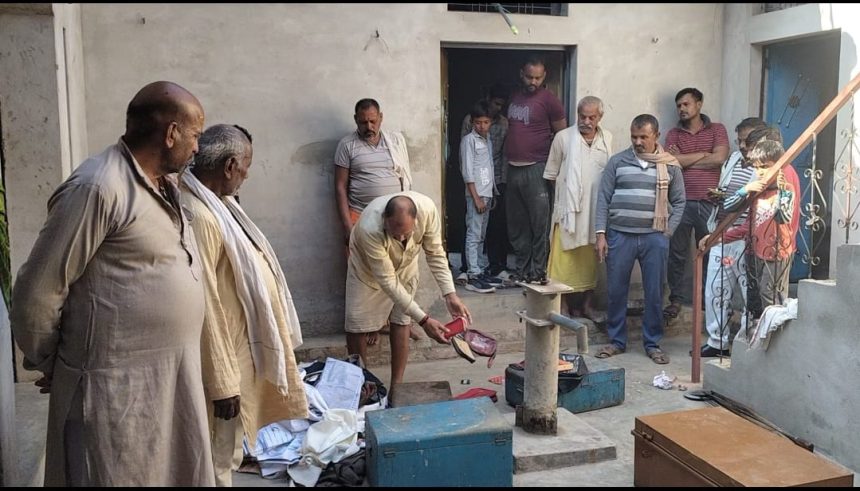 कमासिन/बांदा। थाना क्षेत्र के ग्राम बंथरी में 6/7 फरवरी की रात में संयुक्त परिवार के घर में लगे लोहे के दरवाजों में बंद तालो को तोड़कर कमरे में रखे बक्सों जिनमें महिलाओं के सोने चांदी के जेवरात एवं नगदी रुपए एक लाख पन्द्रह हजार और उमाकांत के घर में रखे महिलाओं के सोने चांदी के जेवरात व 36000 रुपए एक शूटकेश में रखे थे अज्ञात चोर चुरा कर ले जाने में सफल रहे। सभी चोरों ने रिहायसी मकान के सभी दरवाजों को महिलाओं की ही साड़ी से बांधकर चोरी की घटना को अंजाम दिया ।चोरी की किसी प्रकार की भनक मकान में निवास कर रहे परिवारजनों को नहीं लगी। घटना की सूचना थाना कमासिन में पीड़ित परिवार के मुखिया लक्ष्मी विलास ने लिखित पत्र देकर दी। ग्रह स्वामी लक्ष्मी विलास गौतम भतीजे उमाकांत गौतम ने बताया कि रात्रि 6/7 फरवरी की 11 बजे के लगभग खाना खाकर परिवार के सभी लोग सो गए थे रात्रि में 2 बजे के लगभग लघुशंका को उठे तो बाहर से दरवाजा कपड़े से बंधा हुआ मिला तभी बड़े लड़के प्रदीप को फोन कर जगाया तो उसके भी कमरे के दरवाजे कपड़े से बंधे थे। किसी तरह बाहर निकल कर देखा तो सभी कमरों में सामान बिखरा हुआ पड़ा था जिन कमरों में बक्से जेवर नग़दी रखे थे उनके ताले टूटे मिले चार बक्से गायब थे।रात्रि में ही चोरी की सूचना मोबाइल से 112 नंबर पुलिस को दी गई इस समय भतीजे उमाकांत गौतम जो दूसरे घर में परिवार सहित रहते हैं उसे भी जगाया जिसके घर में भी सभी दरवाजे कपड़े से बंधे हुए थे लेकिन शोरगुल होने पर उमाकांत के बड़े भाई जगे और घर में चोरी हो जाने की खबर हुई। उमाकांत गौतम ने बताया कि चोर बड़ा बक्सा नहीं उठा पाए छोटा शूटकेश से कपड़े निकाल कर फेंक गए और नगदी 36000 रुपए शूटकेश सहित चुरा कर ले जाने में सफल रहे। घटना की खबर पर थाना कमासिन प्रभारी अजीत प्रताप सिंह ने घटनास्थल का पुलिस बल के साथ निरीक्षण किया खोजबीन करने पर घटनास्थल से 500 मीटर दूर मसूर के खेत में अलग-अलग स्थान पर टूटे पड़े बक्से मिले। जिसमें आधार पासबुक खेती की खतौनी कपड़े पड़े हुए थे और जेवर नग़दी गायब थे।कुछ ही दूर में खेत में ही सीढी भी पड़ी मिली जिससे यह प्रतीत होता है कि अज्ञात चोर सीढी लगा लगाकर मकान की छत पर चढ़कर घर के अंदर घुसकर चोरी की घटना को अंजाम देकर मौके से निकल भागे ।समाचार लिखे जाने तक थाना कमासिन पुलिस ने बी एन एस की धारा 331/4 धारा 305 के तहत मुकदमा पंजीकृत कर लिया है। पीड़ित परिवार ने चोरी की घटना का खुलासा करने की मांग थाना प्रभारी कमासिन से की है ।