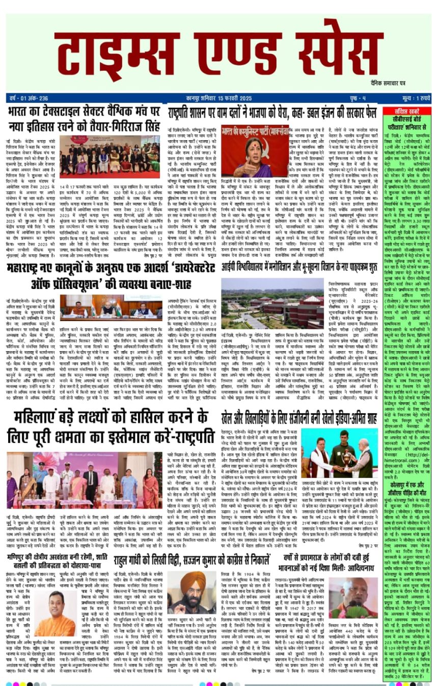 Daily E-paper 15.02.2025 Last updated: 2025/02/15 at 8:42 AM timesandspace Share 0 Min Read SHARE 15.02.2025 You Might Also Like 28.11.2025 27.11.2025 26.11.2025 22.09.2025 20.09.2025 Share This Article Facebook Twitter Copy Link Print Leave a comment Leave a comment Leave a Reply Cancel replyYour email address will not be published. Required fields are marked *Comment * Name * Email * Website Save my name, email, and website in this browser for the next time I comment. E-Magazine 14.07.2025 Monthly E-magazine 05.06.2025 Monthly E-magazine Advertisements E-paper 28.11.2025 Daily E-paper 27.11.2025 Daily E-paper क्या सीमा हैदर को वापस पाकिस्तान भेजा जाना चाहिए? हाँ ना View Results Loading ... Track all markets on TradingView More forecasts: London 30 days weather