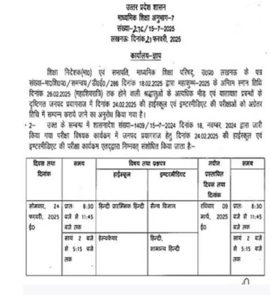 प्रदेश की माध्यमिक शिक्षा मंत्री (स्वतंत्र प्रभार) गुलाब देवी ने बताया कि प्रयागराज में 26 फरवरी के महाशिवरात्रि स्नान के कारण श्रद्धालुओं की अत्यधिक भीड़ एवं यातायात प्रबंधन की दृष्टि से 24 फरवरी को होने वाली हाईस्कूल और इंटरमीडिएट परीक्षाओं को स्थगित कर 9 मार्च, रविवार को पुनः आयोजित किया जाएगा।