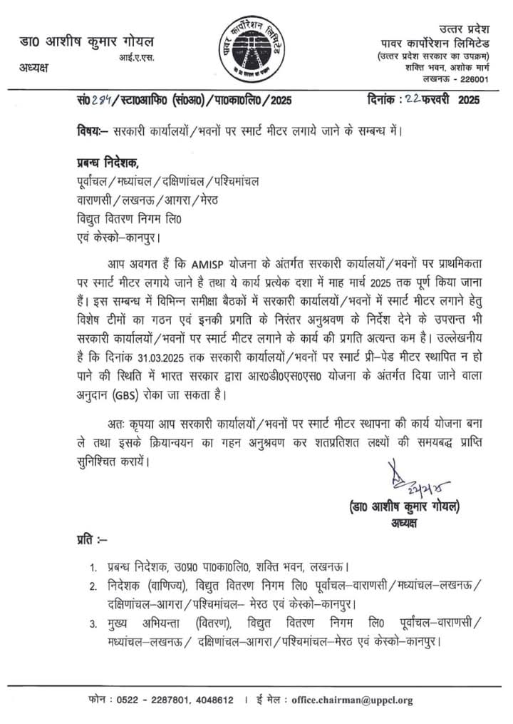 उत्तर प्रदेश में राज्य के सभी सरकारी कार्यालयों और भवनों में स्मार्ट मीटर लगाने के निर्देश उत्तर प्रदेश पावर कॉर्पोरेशन लिमिटेड (UPPCL) के अध्यक्ष आशीष कुमार गोयल द्वारा जारी कहा गया है कि मुख्य उद्देश्य सरकारी भवनों में बिजली की खपत की निगरानी करना और ऊर्जा की बचत को बढ़ावा देना है। साथ ही स्मार्ट मीटर लगाने से बिजली की चोरी पर रोक लगेगी और वास्तविक समय में खपत का आंकलन किया जा सकेगा। गोयल ने सभी संबंधित विभागों को इस आदेश का सख्ती से पालन करने के निर्देश दिए हैं। स्मार्ट मीटर प्रणाली पूरी तरह से डिजिटल होगी और इसे एक केंद्रीय सर्वर से जोड़ा जाएगा, जिससे उपभोक्ता अपनी खपत की जानकारी ऑनलाइन देख सकेंगे। इसके अलावा, मीटर प्रीपेड और पोस्टपेड दोनों मोड में काम करेंगे, जिससे भुगतान प्रक्रिया पारदर्शी होगी। उत्तर प्रदेश पावर कॉर्पोरेशन ने यह भी स्पष्ट किया है कि स्मार्ट मीटर लगाने की प्रक्रिया चरणबद्ध तरीके से की जायेगी।