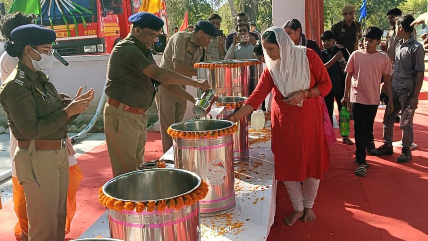 बाँदा/- महाकुम्भ-2025 के सफल समापन के उपरांत मुख्यमंत्री योगी आदित्यनाथ की इच्छा नुरुप त्रिवेणी संगम के पवित्र जल का आमजन मानस एवं श्रद्धालुओं में सभी जनपदों में वितरण किया जा रहा है इसी क्रम में आज जनपद बाँदा के पुलिस लाइन में श्रद्धालुओं के लिए पवित्र जल का वितरण किया गया ।जनपद बांदा से महाकुंभ में प्रयागराज ड्यूटी पर लगे फायर टेण्डर में ड्यूटी से वापस आते समय लगभग 4500 लीटर संगम का पवित्र जल बांदा लाया गया । आज पुलिस लाइन में राधा-कृष्ण मंदिर प्रांगण में अपर पुलिस अधीक्षक शिवराज, क्षेत्राधिकारी नरैनी अंबुजा त्रिवेदी व मुख्य अग्निशमन अधिकारी मुकेश कुमार द्वारा पवित्र जल के विधिवत पूजन अर्चना के उपरांत श्रद्धालुओं को जल वितरित किया गया ।