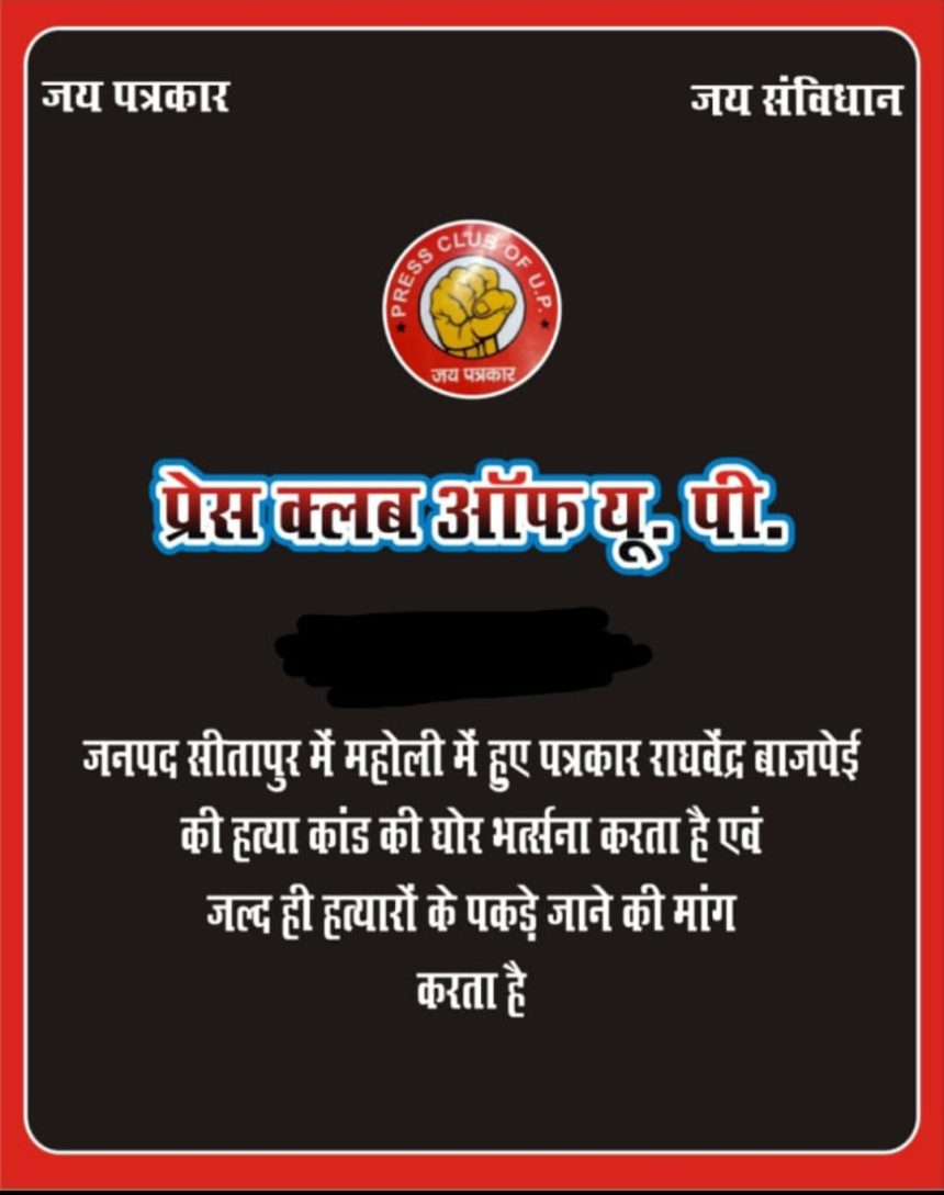 सीतापुर-लोकतंत्र के चौथे स्तंभ पर फिर हमला हुआ है। सीतापुर जनपद के महोली क्षेत्र के स्थानीय पत्रकार राघवेंद्र बाजपेई की दिनदहाड़े गोली मारकर हत्या कर दी गई। वे जब महोली से सीतापुर आ रहे थे, तभी हाईवे पर बाइक सवार बदमाशों ने उन पर हमला कर दिया। तीन गोलियां मारने के बाद हत्यारे फरार हो गए। मिली जानकारी के अनुसार, राघवेंद्र बाजपेई किसी ज़रूरी काम से महोली से सीतापुर जा रहे थे। तभी रास्ते में घात लगाए बदमाशों ने हाईवे पर उन्हें घेर लिया और उन पर ताबड़तोड़ गोलियां बरसा दीं। तीन गोलियां लगने के बाद राघवेंद्र लहूलुहान होकर सड़क पर गिर पड़े। आसपास के लोगों ने तत्काल पुलिस को सूचना दी।पुलिस मौके पर पहुंची और घायल पत्रकार को अस्पताल ले जाया गया, लेकिन डॉक्टरों ने उन्हें मृत घोषित कर दिया।