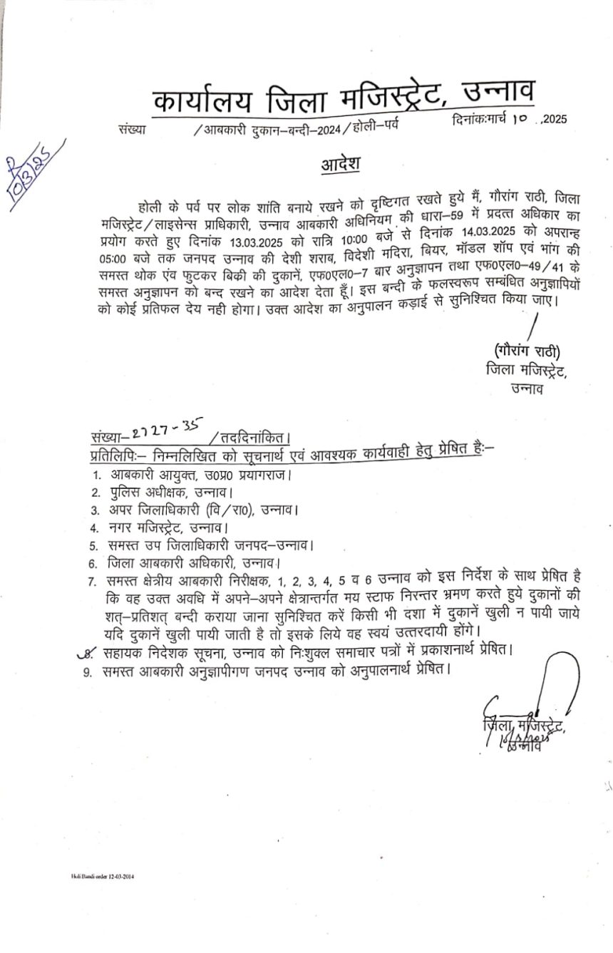 होली पर 14 मार्च को सुबह 10 बजे से शाम 5 बजे तक बंद रहेगी सभी शराब की दुकानें,