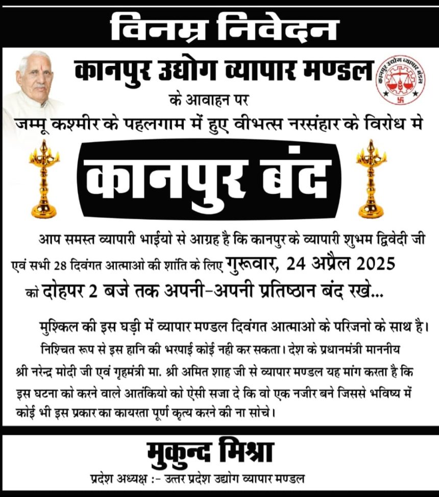 कश्मीर में हुए गोलीकांड के विरोध में कानपुर उद्योग व्यापार मण्डल ने आज दोपहर 2 बजे तक कानपुर बंद का आह्वान किया है। कई अन्य संगठनों ने भी इस बंद का समर्थन किया है।