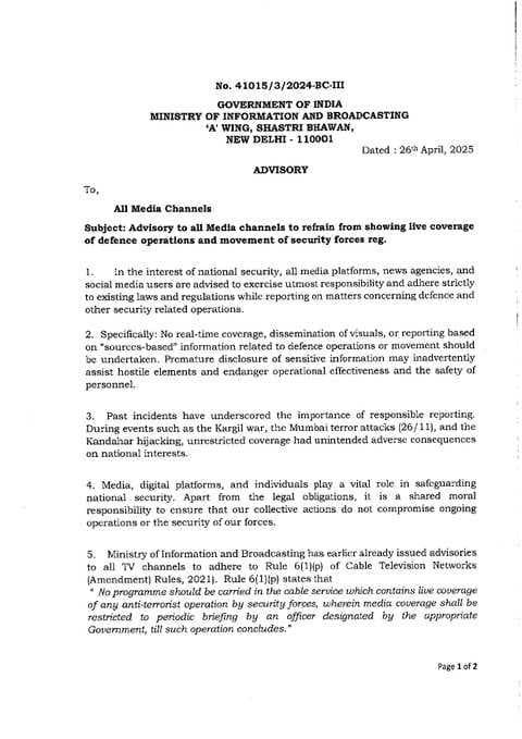 दिल्ली: मीडिया चैनलों के लिए भारत सरकार की एडवाइजरी