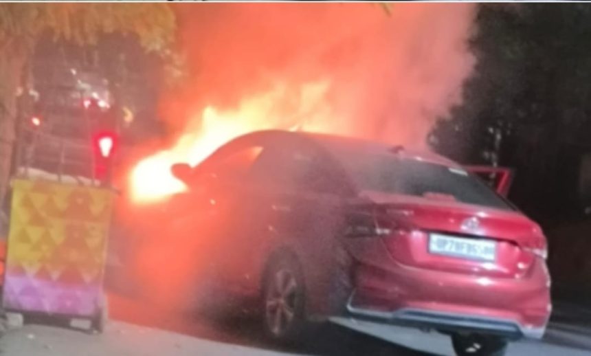 अचानक लगी कार में आग। मां बेटे ने कार से कूद के बचाई जान.