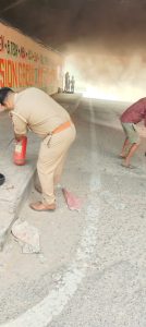 कोयला नगर पुल के अंडरपास के नीच अचानक बाइक में आग लगी बाइक आग बुझाते पुलिसकर्मी