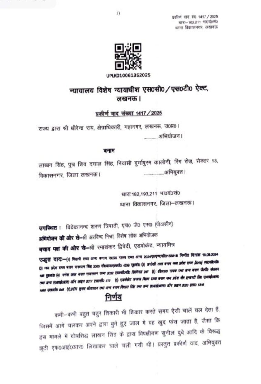 विशेष न्यायाधीश एससी/एसटी एक्ट विवेकानंद शरण त्रिपाठी की अदालत ने आज एक ऐतिहासिक फैसला सुनाया। झूठी एफआईआर दर्ज कर अदालती प्रक्रिया का दुरुपयोग करने पर अधिवक्ता लाखन सिंह को कुल 10 साल 6 महीने की कैद और ₹2.51 लाख जुर्माने की सजा सुनाई, फैसले में कहा गया कि