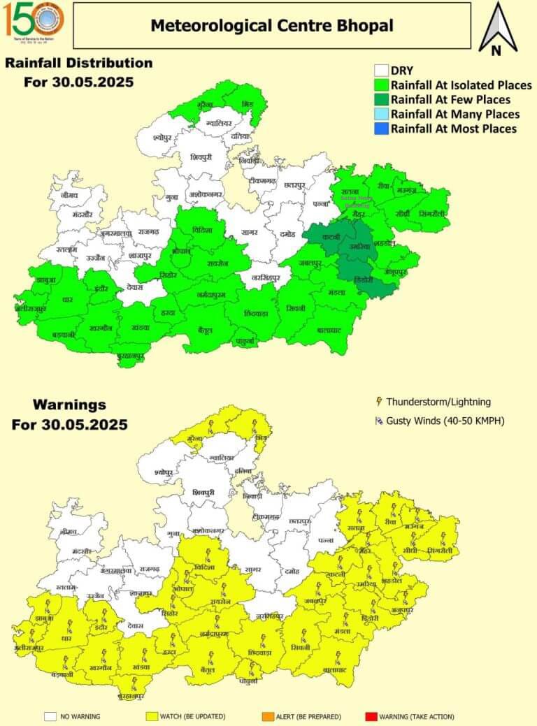 भोपाल, जबलपुर, इंदौर, झाबुआ,अलीराजपुर, बड़वानी, धार, खरगोन, बुरहानपुर, खंडवा, हरदा, विदिशा, सीहोर, रायसेन, नर्मदापुरम, बैतूल, छिंदवाड़ा, पांढुर्णा, सिवनी, बालाघाट, मंडला, डिंडौरी, अनूपपुर, शहडोल, उमरिया, कटनी, मैहर, *सतना*, रीवा, मऊगंज, सीधी, सिंगरौली, मुरैना और भिंड में आंधी-बारिश होने की संभावना।