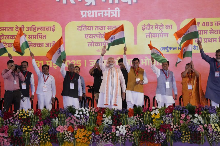 चित्र भेंट कर अभिवादन किया। प्रधानमंत्री श्री मोदी जी को मुख्यमंत्री डॉक्टर मोहन यादव ने पगड़ी पहना कर तथा बैतूल जिले के भरेवा शिल्प से निर्मित पुष्पक विमान भेंट कर उनका स्वागत अभिवादन किया।