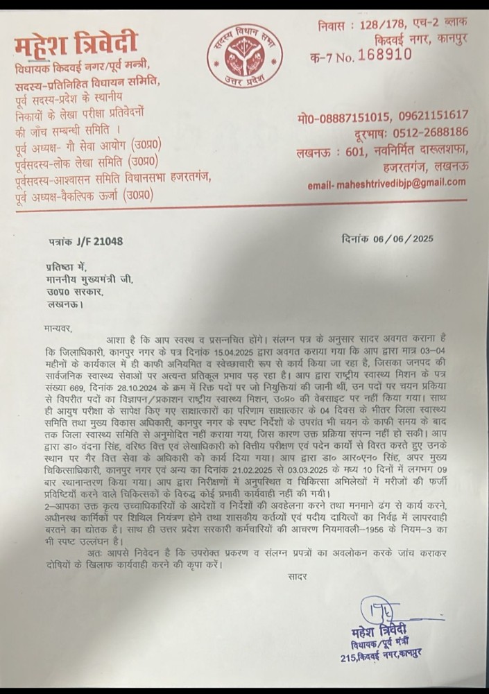 *डीएम व सीएमओ की जंग रोचक मोड़ पर, डीएम के पक्ष में दूसरे विधायक महेश त्रिवेदी का चिट्ठियास्त्र सीएमओ की टैरिटरी में लैंड हुआ ।*