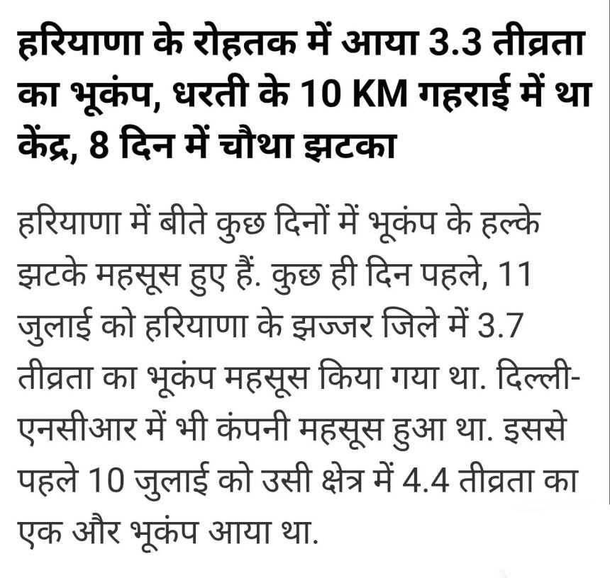 *हरियाणा में आया देर रात 12:46 पर 3.3 तीव्रता का भूकंप, रोहतक के खेड़ी सांपला के धरती के 10 KM गहराई में था केंद्र, 8 दिन में चौथा झटका*