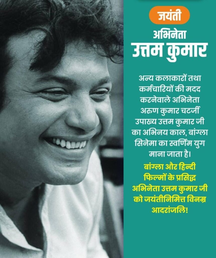 *अमानुष और आनंद आश्रम जैसी यादगार फिल्मों में दिल को छू लेने वाला अभिनय करने वाले महान अभिनेता उत्तम कुमार जी की आज 03 सितंबर को जयंती है। शानदार अभिनय के लिए उन्हें हमेशा याद किया जाता रहेगा*
