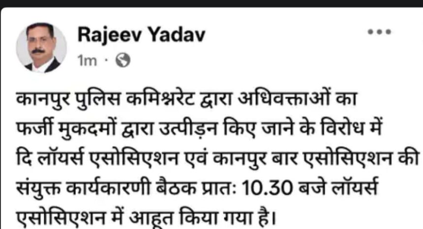 कानपुर कमिश्नरेट के सेंट्रल जोन के नवाबगंज थाना क्षेत्र में रहने वाले चर्चित अधिवक्ता सोनभद्र जेल में बंद एडवोकेट दीनू उपाध्याय का इंटररेंज गैंग घोषित होने के बाद वकीलों में फेसबुक पोस्ट कर नाराजगी व्यक्त कर आज दोपहर 1:30 बजे दि लॉयर्स एसोसिएशन की ओर से बैठक आयोजित की गई है। वहीं वकीलों की नाराजगी व माहौल बिगड़ने की आशंका के चलते पुलिस ऑफिस में पीएसी और क्यूआरटी (क्विक रिस्पांस टीम) की भारी संख्या में पुलिस तैनाती की गई है।*
