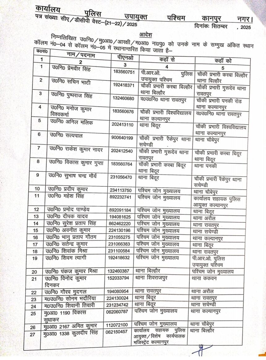 *कानपुर पुलिस कमिश्नरेट पश्चिमी जोन के कई चौकी प्रभारी के हुए ट्रांसफर।