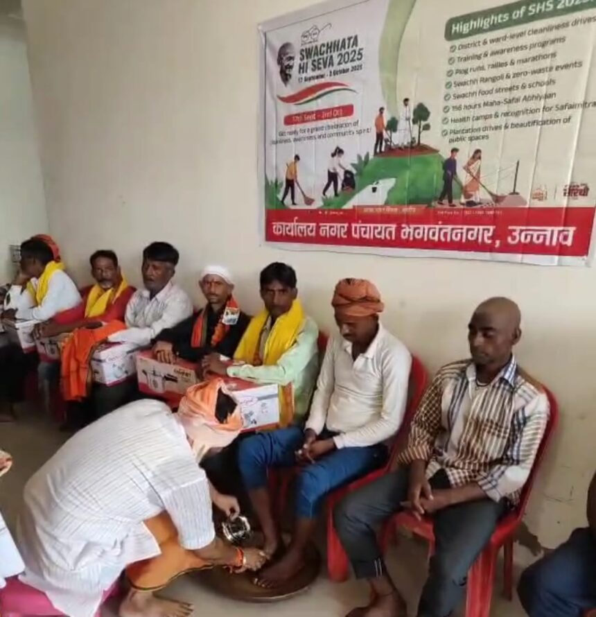 एंकर:// खबर उन्नाव से है जहाँ आज विश्वकर्मा जयंती और प्रधानमंत्री नरेंद्र मोदी के जन्म दिवस के अवसर पर, नगर पंचायत भगवंतनगर के अध्यक्ष आशीष कुमार शुक्ला (रिंकू) ने बुधवार को ‘सेवा पखवाड़ा’ अभियान के तहत एक विशेष कार्यक्रम का आयोजन किया। इस दौरान उन्होंने सफाईकर्मियों के पैर धोकर, उन्हें तिलक लगाकर, अंगवस्त्र भेंटकरउन्हें उपहार देकर सम्मानित किया।चेयरमैन आशीष शुक्ला ने कहा कि हमारे नगर को स्वच्छ और सुंदर रखने में सफाईकर्मियों का विशेष योगदान रहता है। उन्होंने सफाईकर्मियों को सम्मान देते हुए कहा, “इनकी निस्वार्थ सेवा और कड़ी मेहनत के प्रति आभार व्यक्त करने के लिए यह कार्यक्रम आयोजित किया गया है।” यह सम्मान इन कर्मयोगियों के प्रति सच्ची श्रद्धा का प्रतीक है। वही भारतीय जनता पार्टी द्वारा चलाए जा रहे ‘सेवा पखवाड़ा’ अभियान के अंतर्गत आयोजित इस कार्यक्रम में चेयरमैन ने स्वच्छता के महत्व पर भी जोर दिया। उन्होंने कहा कि यह अभियान समाज के हर वर्ग के प्रति सम्मान और सेवा की भावना को बढ़ावा देता है। इस पहल के माध्यम से, नगर पंचायत ने समाज के सबसे महत्वपूर्ण वर्गों में से एक, सफाईकर्मियों के प्रति अपनी संवेदनशीलता और सम्मान को दर्शाया है। यह कार्यक्रम ‘सेवा पखवाड़ा’ की शुरुआत का प्रतीक है, जो 2 अक्टूबर को महात्मा गांधी की जयंती तक चलेगा। इस दौरान विभिन्न जनसेवा कार्यक्रमों का आयोजन किया जाएगा, जिसमें स्वच्छता, स्वास्थ्य और पर्यावरण संरक्षण पर ध्यान केंद्रित किया जाएगा।