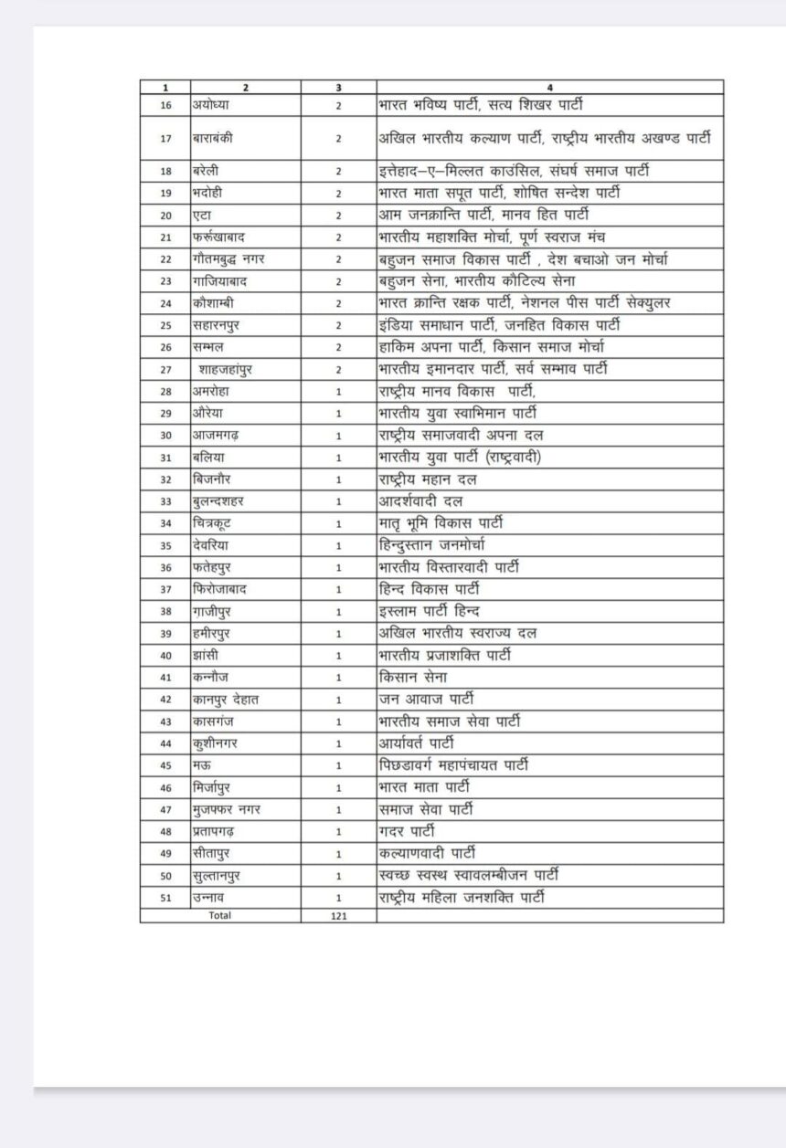 उत्तर प्रदेश में 121 राजनीतिक दलों की मान्यता खत्म कर दी गई है, क्योंकि उन्होंने पिछले 6 सालों में कोई चुनाव नहीं लड़ा है। ये दल उत्तर प्रदेश के 51 जिलों में पंजीकृत थे। मान्यता खत्म होने से इन दलों को चुनाव चिह्न और टैक्स छूट जैसे अधिकार नहीं मिलेंगे।