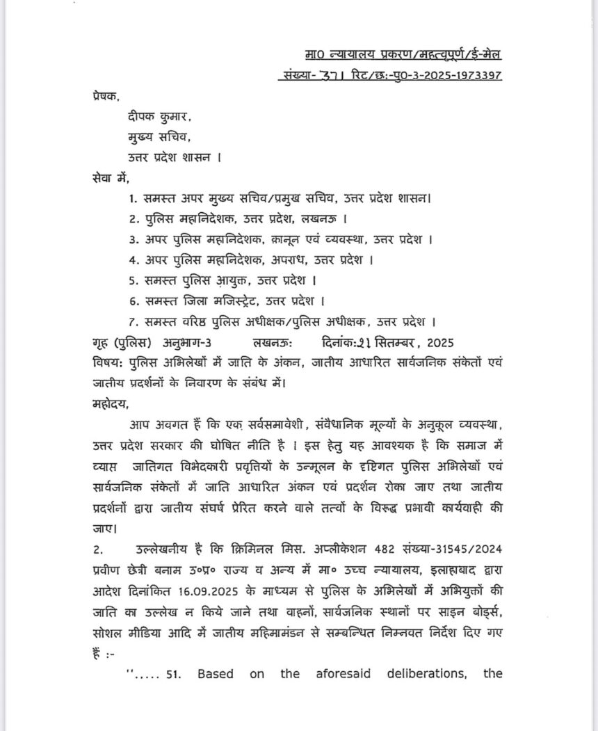 हाईकोर्ट के आदेश के अनुपालन में पुलिस रिकॉर्ड्स और सार्वजनिक स्थलों से जाति के उल्लेख पर रोक-