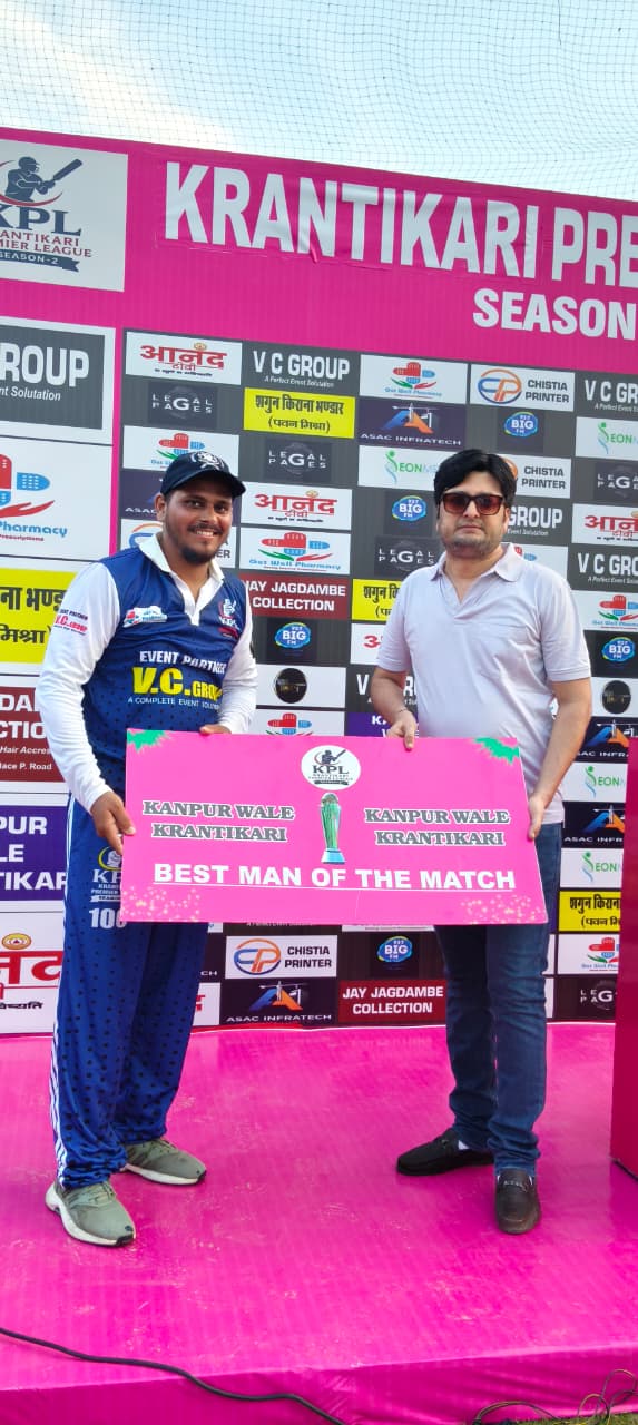 आज कानपुर वाले क्रांतिकारी संगठन द्वारा आयोजित क्रांतिकारी प्रीमियर लीग- 2 के दूसरे मैच में क्रांतिकारी ब्लैक ने टाॅस जीतकर पहले गेंदबाजी का चयन किया। पहले बल्लेबाजी करते हुए क्रांतिकारी ब्लू ने निर्धारित 20 ओवर में 10 विकेट खोकर 143 रन बनाए। जिसमें सौरभ राय ने 35, मनोज ने 18 तथा राघवेन्द्र सिंह ने 16 रनों का योगदान दिया। क्रांतिकारी ब्लैक की ओर से शोभित शर्मा,डी•जे•, राहुल कश्यप ने 2-2 विकेट हासिल किये। जवाब में बल्लेबाजी करते हुए क्रांतिकारी ब्लैक मात्र 105 बना सकी। क्रांतिकारी ब्लैक की ओर से अभिनय दीक्षित ने 45, शशांक साहू ने 11 तथा डी•जे• ने 10 रनों का योगदान दिया ।क्रांतिकारी ब्लू की ओर से राघवेन्द्र सिंह ने 3 विकेट तथा सौरभ राय और मनोज ने 2-2विकेट हासिल किये।फाइटर ऑफ़ द मैच अभिनय दीक्षित, मैन ऑफ़ द मैच सौरभ राय,बेस्ट बॉलर राघवेन्द्र सिंह,बेस्ट बैट्समैन सौरभ राय,फेयर प्लेयर ऑफ द मैच शोभित शर्मा रहे । इस अवसर पर संगठन अध्यक्ष आशीष मिश्रा, मुख्य अतिथि अंकुर खंडेलवाल,गोपेन्द्र सिंह भदौरिया, गोपाल, सुनील, गुरप्रीत,अजय, पवन मिश्रा, रवि यादव आदि उपस्थित रहे।
