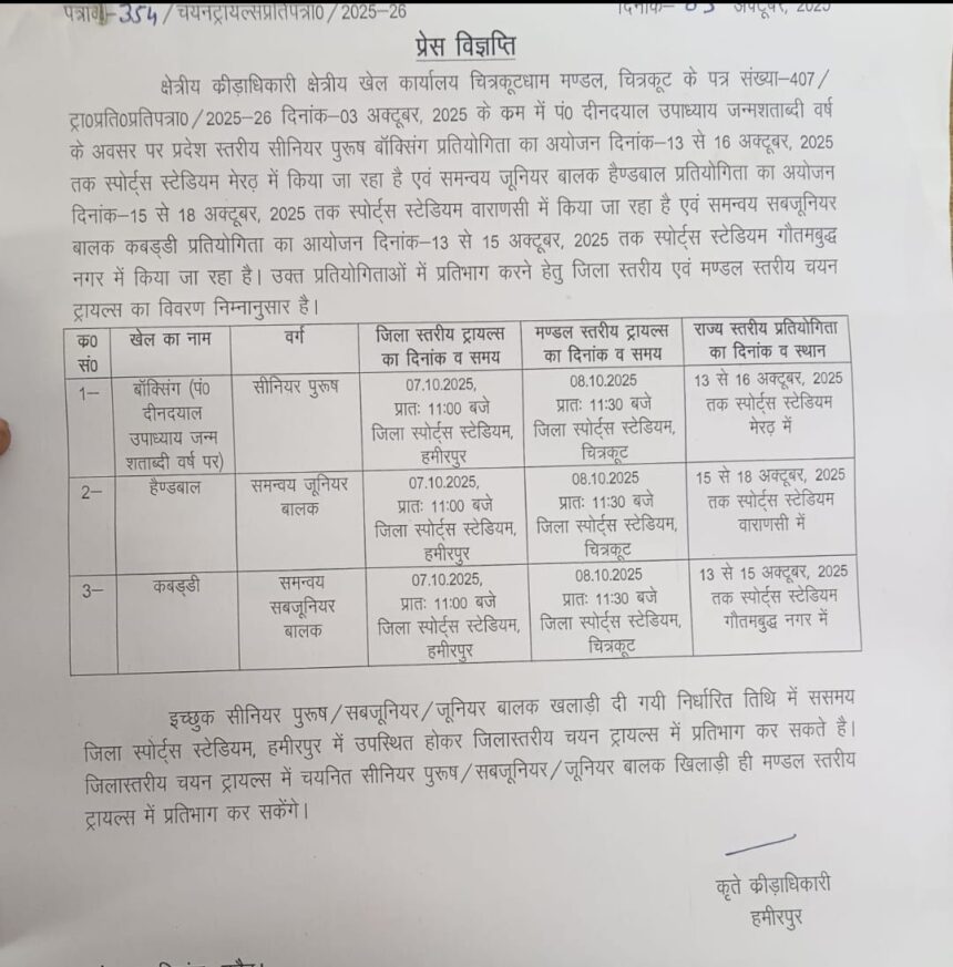 जिला स्तरीय चयन ट्रायल 7 अक्टूबर 2025 को सुबह 11 बजे जिला स्पोर्ट्स स्टेडियम, हमीरपुर में होंगे। इसके बाद मंडल स्तरीय चयन ट्रायल 8 अक्टूबर 2025 को चित्रकूट स्पोर्ट्स स्टेडियम में होंगे।