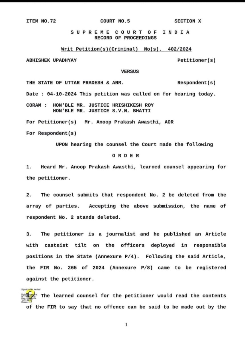 सुप्रीम कोर्ट ने पत्रकार अभिषेक उपाध्याय की गिरफ्तारी पर रोक लगा दी है।कोर्ट ने यूपी पुलिस को नोटिस जारी कर जवाब मांगा है।कोर्ट ने अपने आदेश में लिखा है, कि पत्रकार को उसके विचार अभिव्यक्ति की स्वतंत्रता संविधान के अनुच्छेद 19(1) से सुरक्षित है।