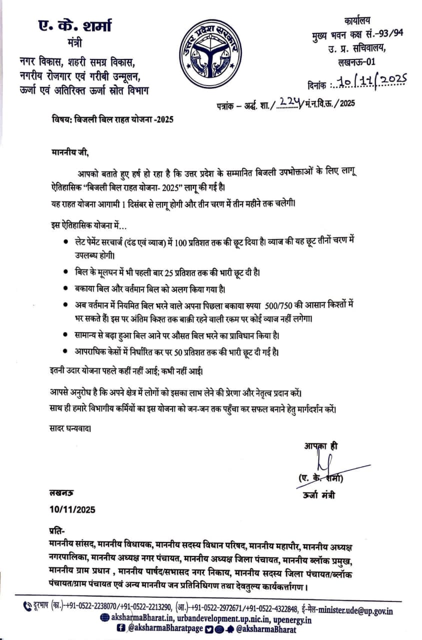 *उत्तर प्रदेश सरकार ने बिजली उपभोक्ताओं को जबरदस्त राहत देते हुए ‘बिजली बिल राहत,योजना 2025’ लागू करने का ऐलान कर दिया है*।