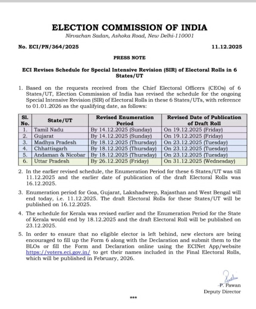 *सबसे बड़ा बदलाव उत्तर प्रदेश के लिए किया गया है, जहां BLO पर लगातार बढ़ते काम के बोझ और समीक्षा कार्य की धीमी गति को देखते हुए 15 दिनों का अतिरिक्त समय दिया गया है*।