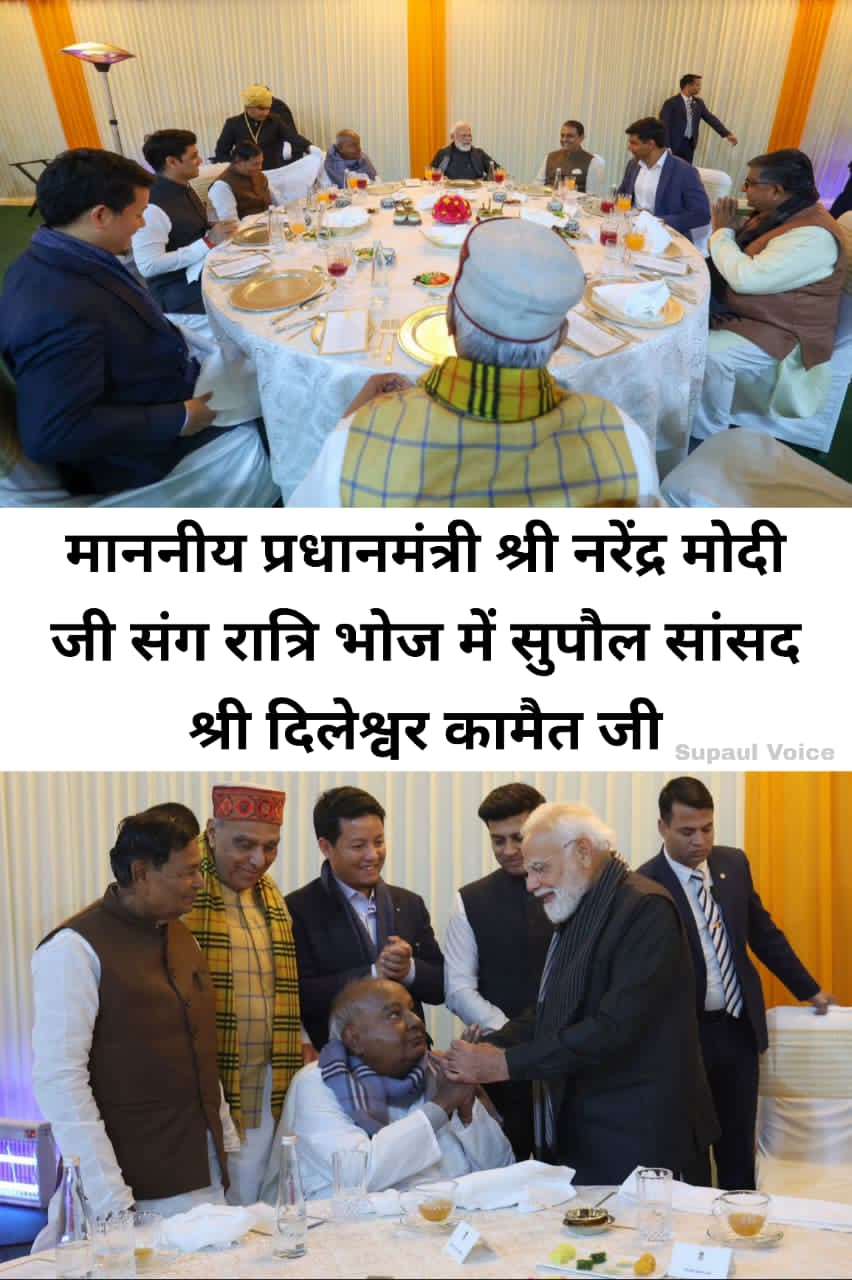 बीती रात प्रधानमंत्री आवास पर आयोजित रात्रि भोज में माननीय प्रधानमंत्री श्री नरेंद्र मोदी जी संग सुपौल सांसद श्री दिलेश्वर कामैत जी, सुपौल सहित कोसी की धरती के लिए गर्व और सम्मान का ऐतिहासिक क्षण!