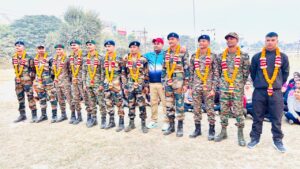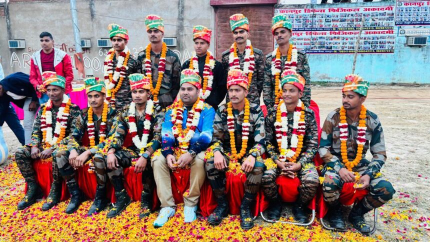 भारतीय सेना में चयनित हुए दर्जनों जवानों के सम्मान हेतु आयोजित सम्मान समारोह का आयोजन कानपुर डिफेन्स फिजिकल एकेडमी में किया गया। नौबस्ता बंबा रोड पर जैसे ही सेना में चयनित छात्र पहुंचे बड़ी संख्या में मौजूद छात्र छात्राओं सहित क्षेत्रीय आम जनमानस ने पुष्प वर्षा कर स्वागत किया। इस मौके पर डायरेक्टर सौरभ शुक्ला ने बताया कि विगत कई वर्षों से उत्तर प्रदेश सहित अन्य राज्यों के तकरीबन 14 हजार छात्र छात्राओं को एकेडमी के कुशल मार्गदर्शन एवं प्रशिक्षण से विभिन्न विभागों में चयन हो सका है। बेहतर फिजिकल तैयारियों एवं कड़े निर्देशों की बदौलत ही कानपुर डिफेन्स फिजिकल एकेडमी भारत में छात्र छात्राओं की पहली पसन्द है। आज सेना में चयनित हुए छात्रों को बाबा श्री श्याम की प्रतिमा भेट कर उज्ज्वल भविष्य की कामना उनके द्वारा की गई। डायरेक्टर सौरभ शुक्ला ने एकेडमी के शिक्षकों की प्रशंसा करते हुए कहा कि आपकी कुशल क्षमता एवं निर्देशन के कारण ही आज भारी संख्या में जवानों का चयन हुआ है। श्री शुक्ला ने इस दौरान बड़ी संख्या में मौजूद छात्र छात्राओं को संबोधित करते हुए कहा कि आपको भी कठिन परिश्रम करना होगा तब कही कही जाकर सफलता मिल सकेगी। सेना में चयनित छात्रों ने हनुमान जी महाराज के मंदिर जाकर माथा टेक अपनी अपनी टोपियां भगवान के चरणों में समर्पित की। इस दौरान भारत माता की जय वंदे मातरम के जोरदार नारे लगाए गए। मुख्य रूप से कोच आदित्य अंकित मैनेजर शैलेन्द्र यादव श्याम सहित काफी संख्या में पदाधिकारी मौजूद रहे।