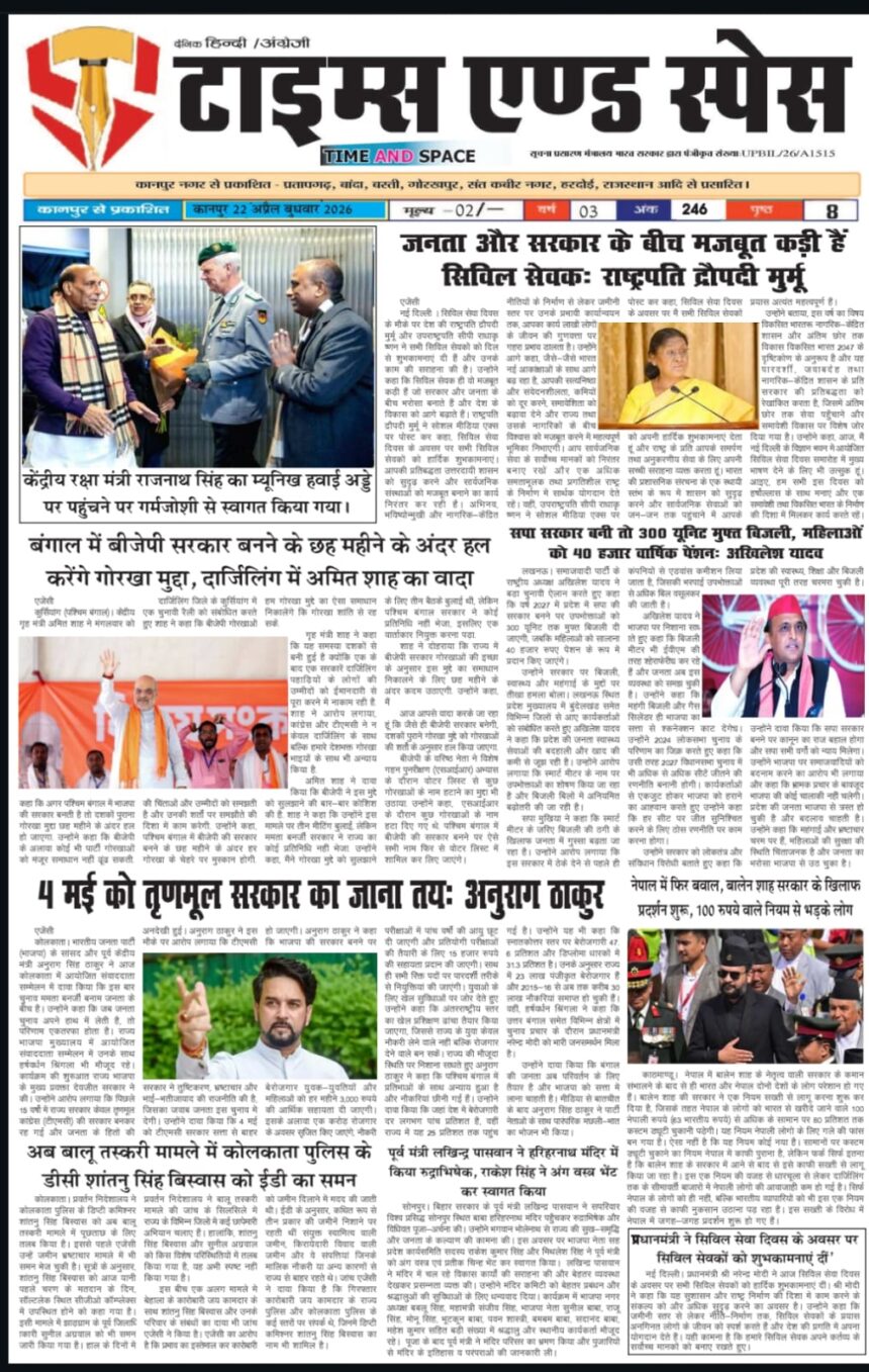 Uncategorized 22.04.2026 Last updated: 2026/04/22 at 1:30 PM timesandspace Share 0 Min Read SHARE 22.04.2026 You Might Also Like *कानपुर में ऑनलाइन IPL सट्टा गिरोह का भंडाफोड़, ₹3.91 करोड़ नकद बरामद* *दोपहर 01 बजे की बड़ी खबरें……………….* दिनांक 21.04.2026 को, विश्व रचनात्मकता और नवाचार दिवस के अवसर पर, उत्तराखंड- ग्यारहवें ज्योतिर्लिंग श्री केदारनाथ धाम के कपाट आज प्रातः 8 बजे पूरे विधि-विधान के साथ श्रद्धालुओं के दर्शनार्थ खोल दिए गए *नवागत उन्नाव जिलाधिकारी घनश्याम मीणा ने पदभार ग्रहण किया।* Share This Article Facebook Twitter Copy Link Print Leave a comment Leave a comment Leave a Reply Cancel replyYour email address will not be published. Required fields are marked *Comment * Name * Email * Website Save my name, email, and website in this browser for the next time I comment. E-Magazine 14.07.2025 Monthly E-magazine 05.06.2025 Monthly E-magazine Advertisements E-paper 12.12.2025 Daily E-paper 11.12.2025 Daily E-paper क्या सीमा हैदर को वापस पाकिस्तान भेजा जाना चाहिए? हाँ ना View Results Loading ... Track all markets on TradingView More forecasts: London 30 days weather