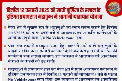 12 फरवरी, 2025 को माघी पूर्णिमा के स्नान के दृष्टिगत ‘प्रयागराज महाकुम्भ’ ट्रैफिक प्लान लागू किया गया है।