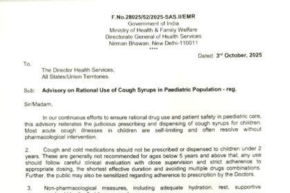 दिल्ली – महत्वपूर्ण खबर – स्वास्थ्य विभाग ने बच्चों को कफ सिरप देने पर एडवायजरी जारी की-