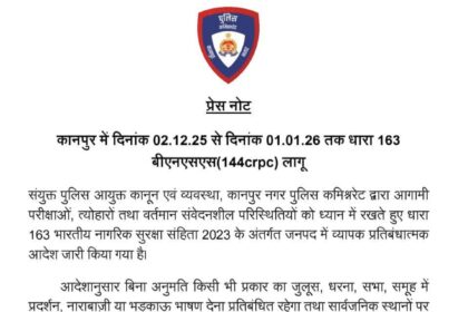 दिनांक 2 दिसंबर 25 से 1 जनवरी 26 तक कानपुर नगर में धारा 144 लागू