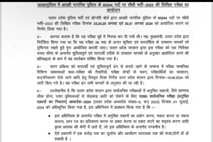 लखनऊ UPP में सिपाही के 60244 पदों पर सीधी भर्ती की लिखित परीक्षा 23,24,25 और 30,31 अगस्त को होगी