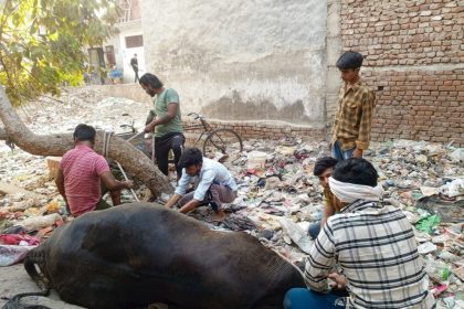 घायल गोवंश का उपचार कर रहे राष्ट्रीय सैनिक छात्र सेवा परिषद के युवा।