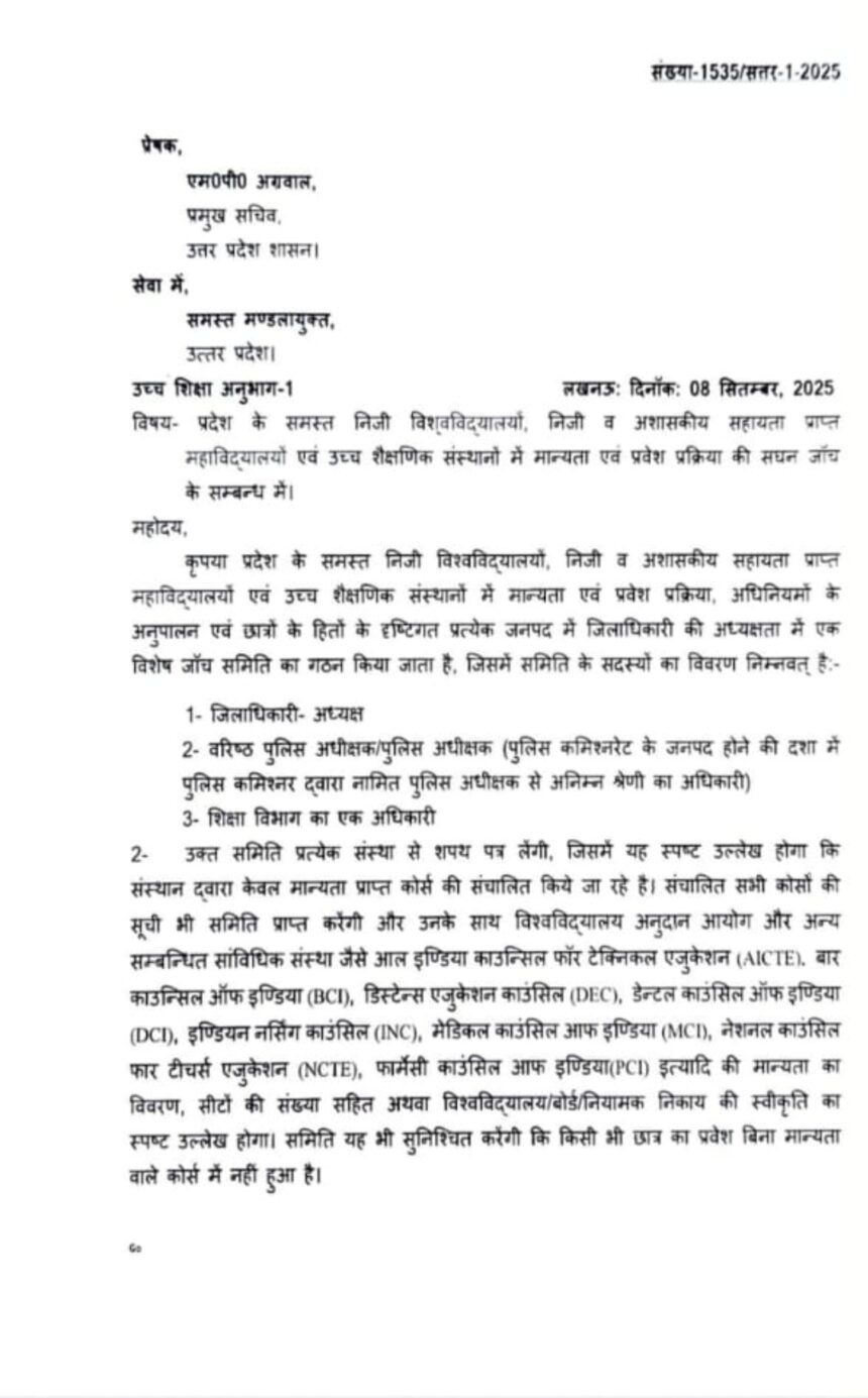 IAS एम.पी. अग्रवाल ने कमिश्नर को पत्र भेजकर यूपी में निजी विश्वविद्यालयों व महाविद्यालयों की सघन जाँच के आदेश जारी