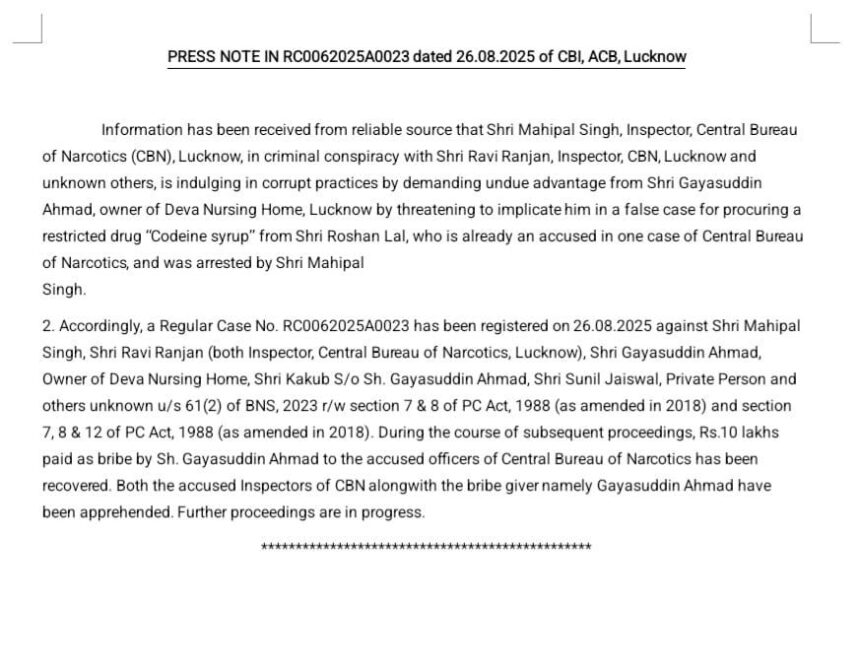 CBI ने सेंट्रल ब्यूरो ऑफ नारकोटिक्स के इंस्पेक्टर महिपाल सिंह और रवि रंजन को लखनऊ से किया गिरफ्तार टाइम्स एंड स्पेस डिस्टिक हेड राहुल द्विवेदी लखनऊ के देवा नर्सिंग होम…