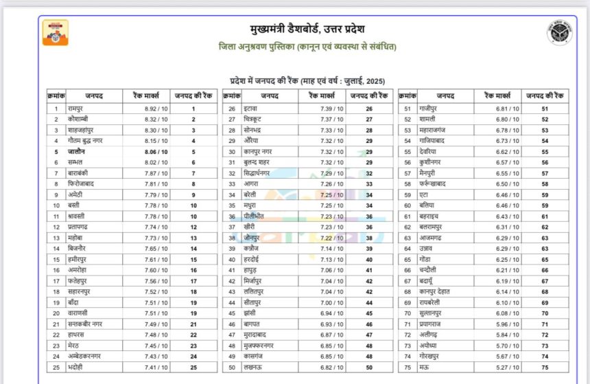 कानून व्यवस्था के लिए जुलाई माह की मुख्यमंत्री डैशबोर्ड रैंकिंग की सूची हुई जारी