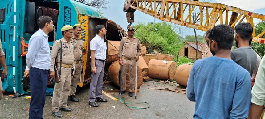 अनियंत्रित होकर पलटा ट्रक गाय की मौत, चालक गंभीर रूप से घायल