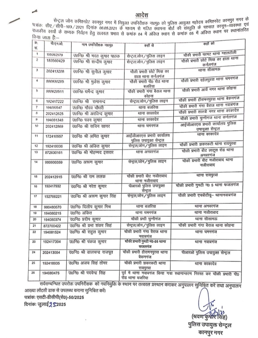 कानपुर पुलिस कमिश्नरेट में सेंट्रल जोन में उपनिरीक्षक के हुए तबादले