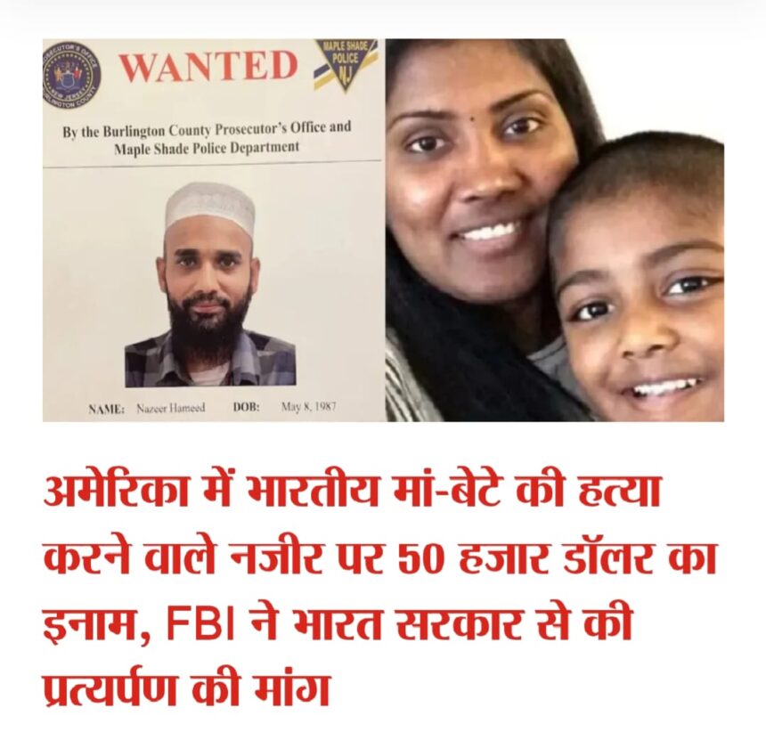 अमेरिका में भारतीय मां बेटे की हत्या करने वाले नजीर पर 50 हजार डॉलर का इनाम घोषित।