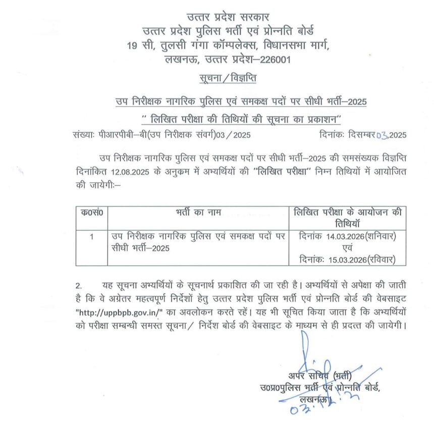 उप्र पुलिस उप निरीक्षक भर्ती – 2025 की लिखित परीक्षा की तारीख घोषित…