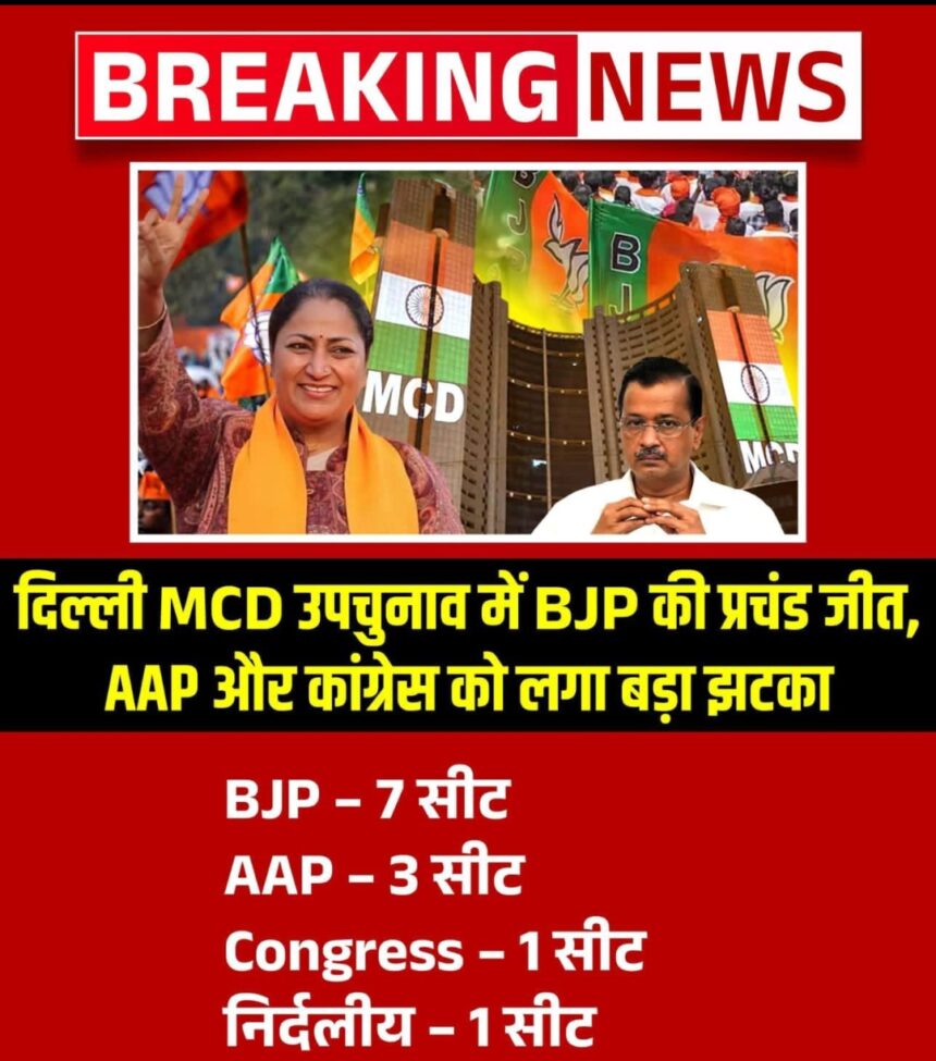 *दिल्ली MCD उपचुनाव में BJP की प्रचंड जीत* , AAP और कांग्रेस को लगा बड़ा झटका *BJP - 7 सीट* AAP - 3 सीट Congress – 1 सीट निर्दलीय -…