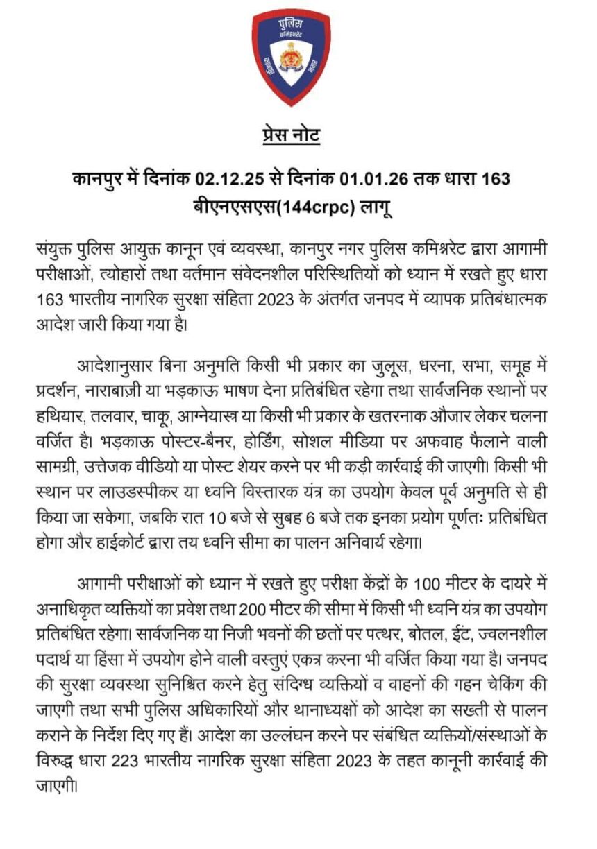 दिनांक 2 दिसंबर 25 से 1 जनवरी 26 तक कानपुर नगर में धारा 144 लागू