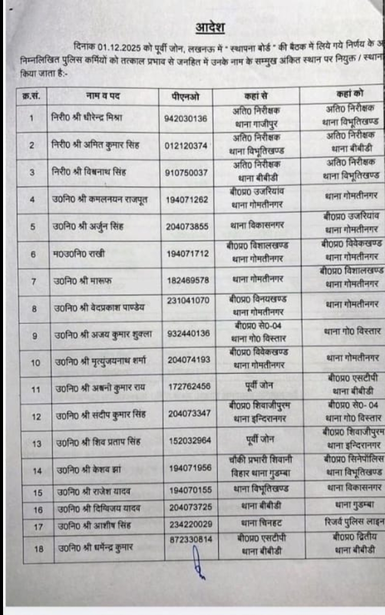 Lko Big Breaking राजधानी लखनऊ के पूर्वी जोन में पुलिस कर्मियों के स्थानांतरण!! निरीक्षकों,उप निरीक्षकों समेत आरक्षियों का हुआ स्थानांतरण!!